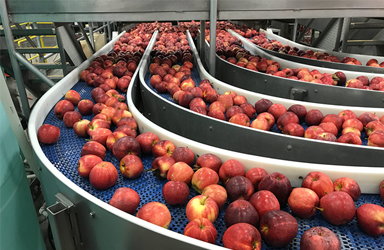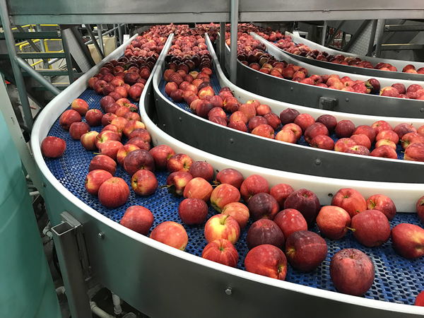 The journey starts with freshly picked apples loaded onto uni Flex L ASB belts, where dirt and debris are rinsed away. The open grid design drains water quickly while resisting acids and moisture, making frequent washdowns simple and effective.